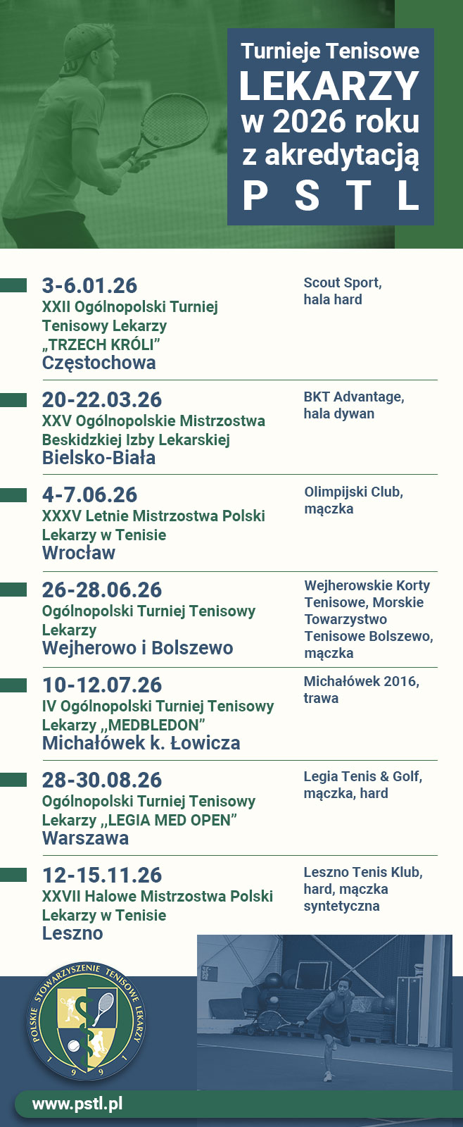 Każdy członek PSTL z opłaconą składką członkowską za 2026 otrzyma podczas Letnich MP Lekarzy we Wrocławiu (4-7.06.26) bezpłatnie oficjalny strój reprezentacyjny PSTL. Aby go otrzymać należy wypełnić formularz i podać rozmiary do dnia 15.04.26. Formularz dostępny jest pod tym linkiem -> https://forms.gle/BbioqFRPC2SKwcvy7